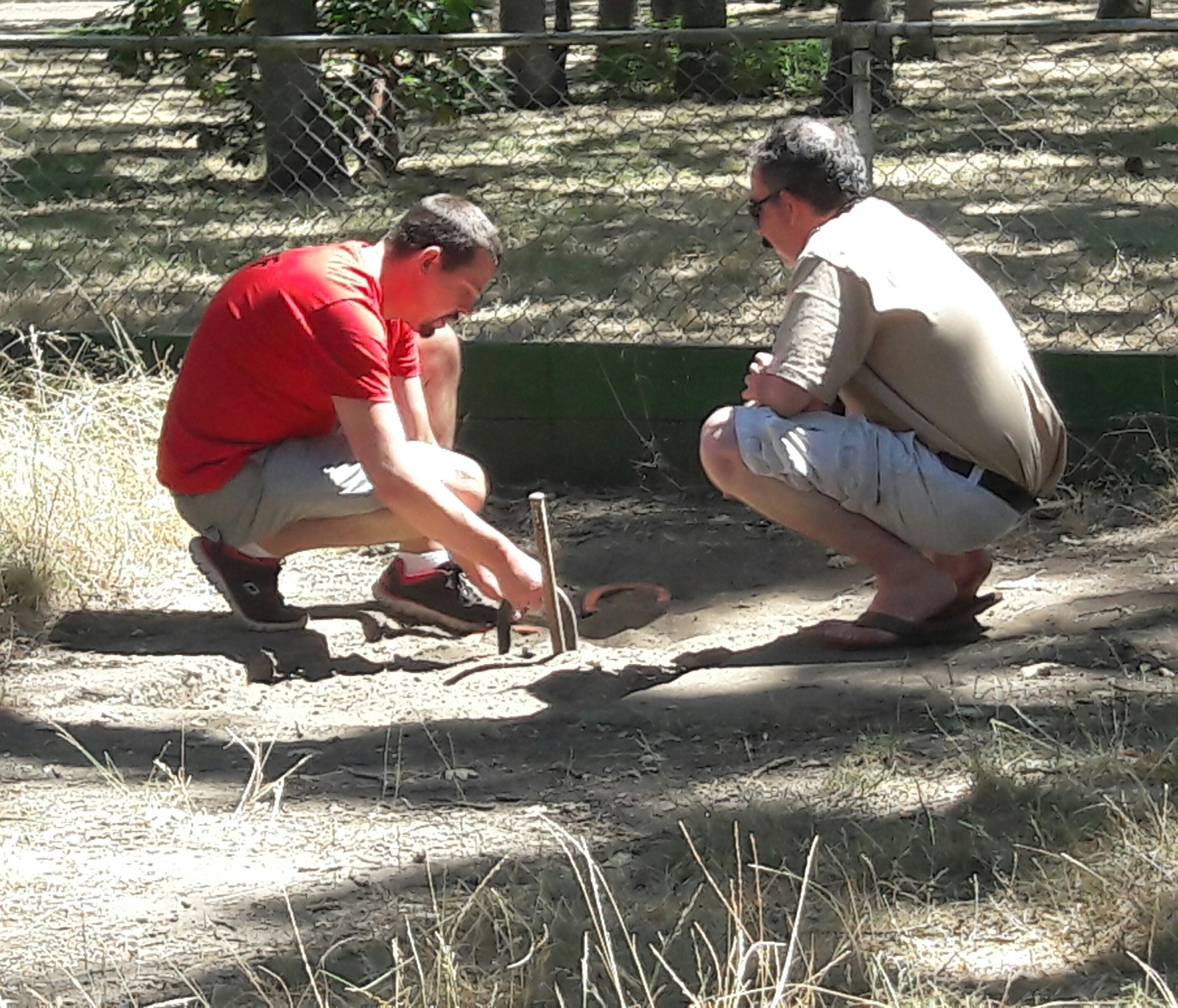 Close enough counts in Horseshoes, right? Two participants debate points during the bracket event over Decathlon Weekend.